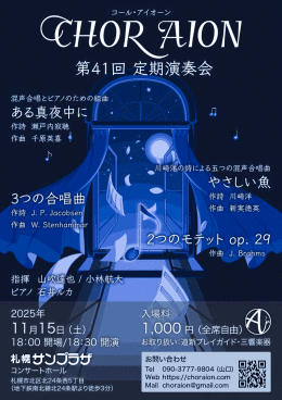 開場 18:00開演 18:30【入場料】1,000円(全席自由)【お取り扱い】道新プレイガイド・山響楽器【お問い合わせ】Tel 090-3777-9804(山口)Web https://choraion.comMail choraion@gmail.com※ 詳しくはこちらのPDFをご覧下さい。